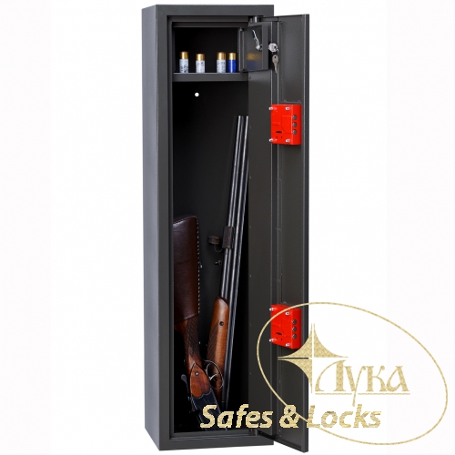 Предназначен для хранения нарезного или гладкоствольного оружия, амуниции к нему и других ценных вещей. Двери фиксируются 2 ключевыми замками. Для крепления к полу или стене в корпусе размещены отверстия для анкерных крепежей.
