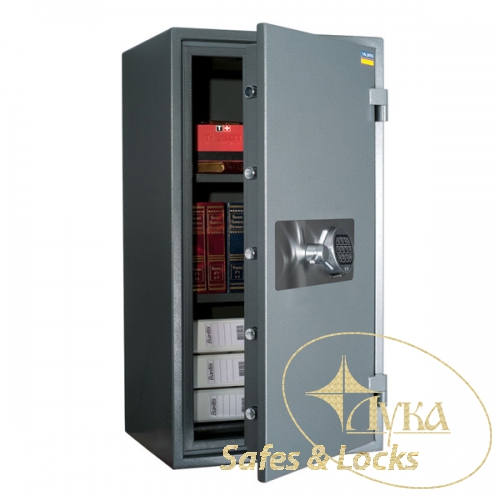 Сейф огнестойкий и устойчивый ко взлому по 2 классу. Пространство между стенками корпуса и двери сейфа заполнено огнестойким бетоном. При заливке двери и корпуса сейфа используется запатентованная система армирования бетона. Противопожарная защита в течение 60 минут, подтвержденная сертификатом согласно ГОСТ Р 50862-2005, класс 60Б. Трехсторонняя ригельная система запирания с восьмью вращающимися ригелями диаметром 25 мм (четыре влево, по два вверх и вниз), что делает невозможным их перепиливание и двумя пассивными ригелями. Система блокировки ригельного механизма при взломе, замок защищен от высверливания специальной твердосплавной пластиной. Внешние петли, позволяющие открывать дверь сейфа на 180°, не перекрывая дверной проем. Оборудован электронным кодовым замком. Предусмотрена возможность крепления сейфа анкерным болтом к полу (анкерный болт в комплекте поставки). Гарантия на сейф 5 лет, на замок - 1 год.