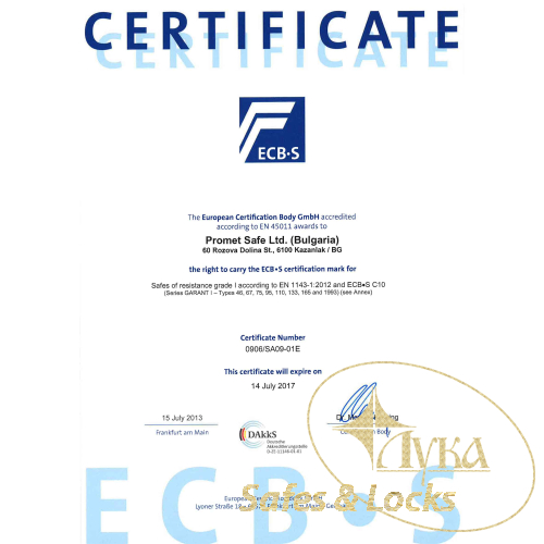 Сейф огне- взломостойкий Valberg Gardian 95T.EL предназначен для сохранения документов и ценностей от опасных факторов пожара и несанкционированного доступа (взлома). Устойчив к взлому - EN 1143-1, grade 1 (ECB-S); ГОСТ Р 50862-2005, класс 2. Огнестойкость - LFS 60P соответствует EN 15659, ГОСТ Р 50862-2005, класс 60Б. Европейские сертификаты, сами сейфы произведены на заводе в Болгарии Толщина защитного слоя лицевой панели - 33 мм, общая толщина двери 105 мм. Толщина боковых стенок - 77 мм, толщина задней стенки – 51 мм.