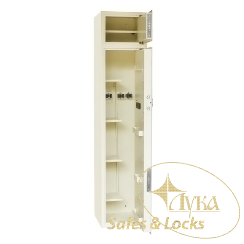 Основная дверь сейфа закрывается на два замка, первый – электронный, второй – ключевой. Оружейный сейф соответствует всем требованиям, предъявляемым к хранению огнестрельного оружия. Рекомендуем дополнительно закрепить сейф анкерными болтами, возможно крепление к полу или стене.