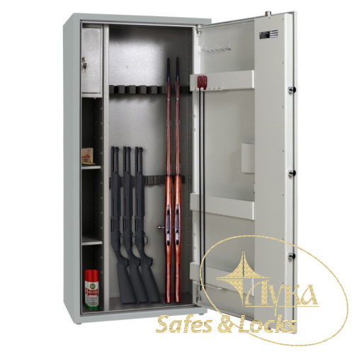 Сейф для оружия отличается антивзломной конструкциею, высокой безопасностью и оптимальными параметрами. Дополнительно на двери сейфа есть отделения для дополнительного хранения, навесы для шомполов, крючки. Сейф предназначенными для хранения оружия высотой до 1350 мм.