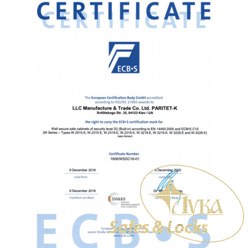 Взломостойкий сейф для оружия Европейской серии GE GRIFFON сертифицирован в Европейской лаборатории ECB-S и имеет сертификат класса S1 по стандарту EN 14450.