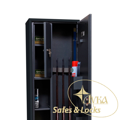 Сейф серии GL для хранения оружия GLST.130.K имеет противовзломную конструкцию дверей, трейзер (кассовое отделение) для хранения патронов и документов, карманы для размещения средств по уходу за оружием или магазинов, держатели и фиксатор под два шомполы, планку для навески. Сейф укомплектован передвижным магнитным ложементом. Все дополнительное оборудование, размещенное на двери, легко снимается.