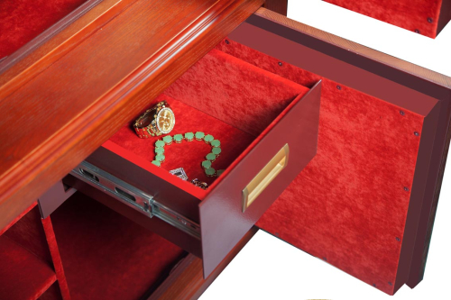 Вся внутренняя поверхность сейфа декорирована мебельной тканью. Снаружи сейф отделан натуральным деревом.